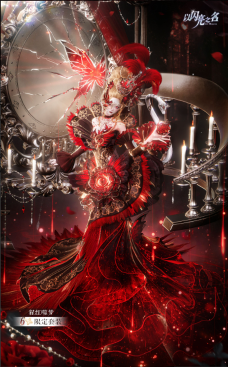 初见这套风格极其强烈的六星套装,浓烈的猩红与暗金构成了直击感官的视觉核心。全新套装以欧洲文艺复兴贵族穿搭为基底的裙装,用抽褶半透视纱撑出极具戏剧感的外轮廓,缎面的厚重与薄纱的轻盈形成材质碰撞,叠加渐变染色的细腻层次,酒红向暗紫晕染的缎面、深红渐透的薄纱,让裙摆既保留了贵族服饰的雍容,又浸着暗黑传说的冷冽潮湿。