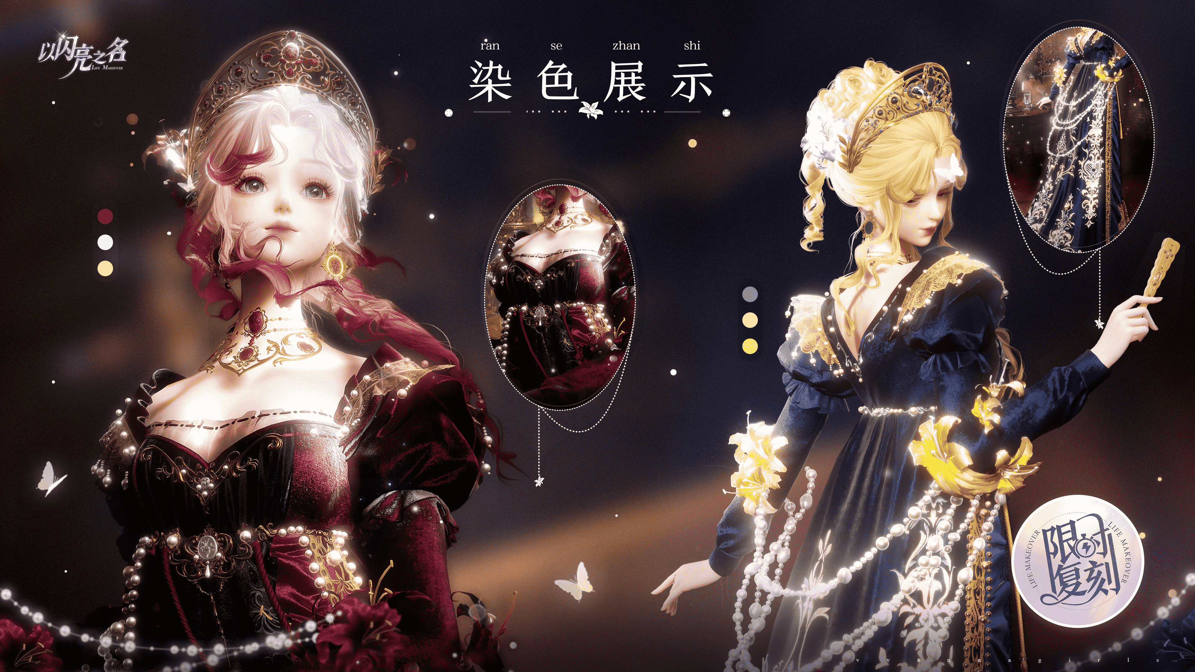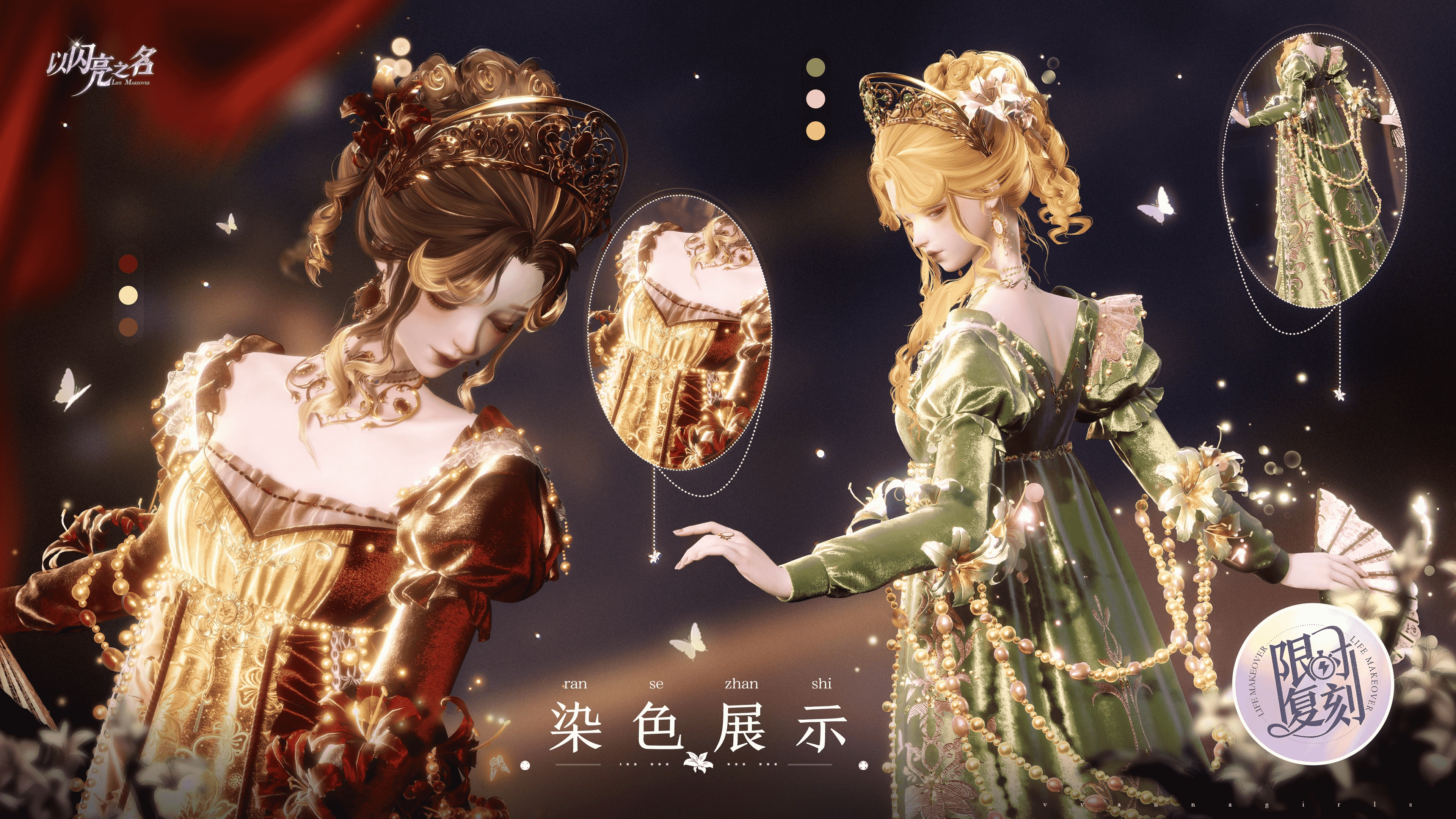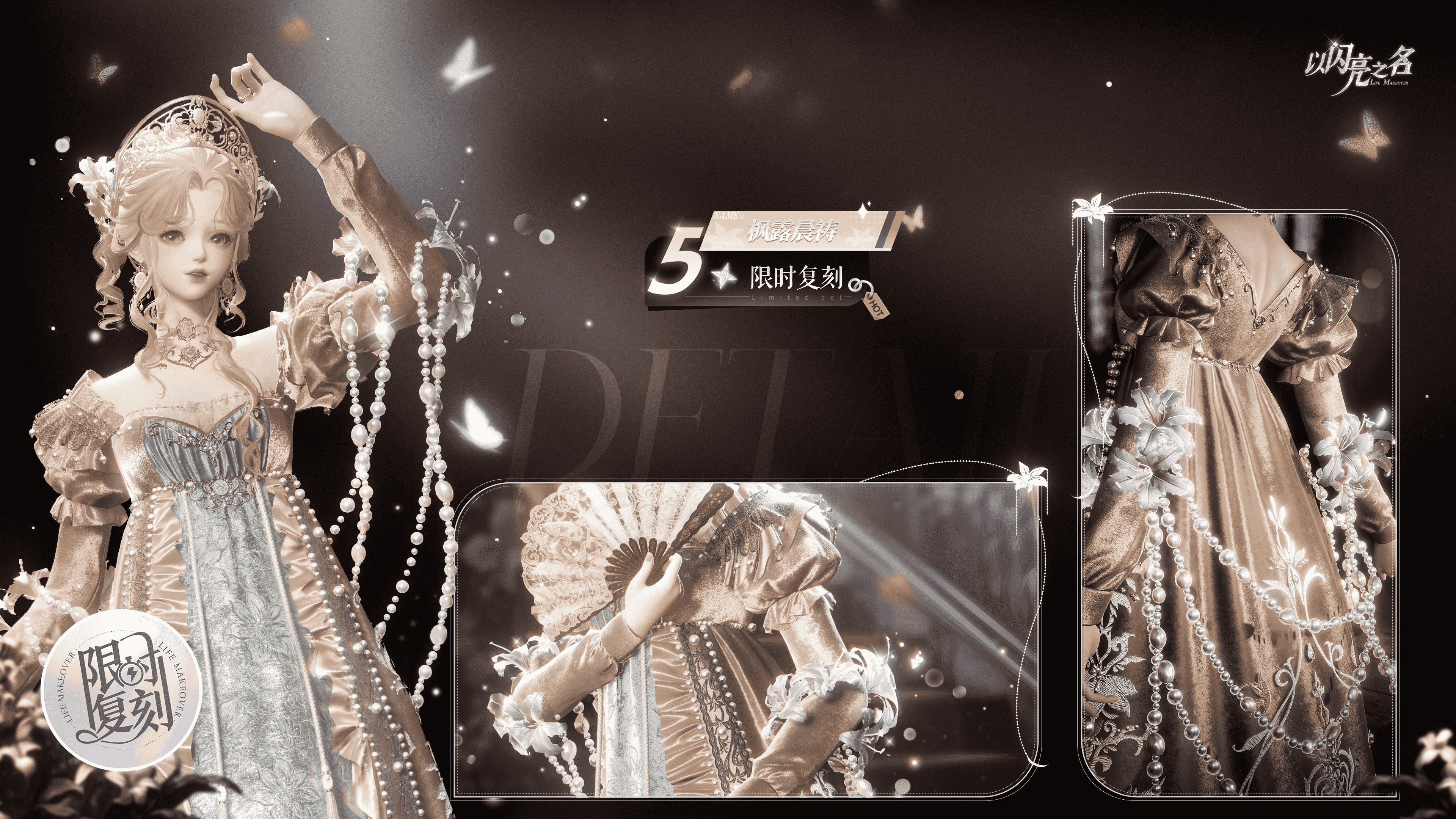 手持扇子可开合,扇面与裙身使用繁复的百合蕾丝花纹相呼应,同时扇子带有蝴蝶飞舞的特效,丰富帝政裙的氛围感。