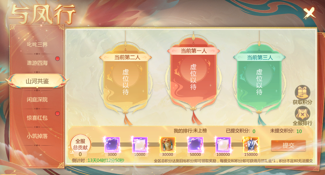 排行前三的少侠将获得《与凤行》联动活动限定称号,积分活动分为个人积分与全服积分,全服达到指定目标积分后可领取限定头像框,快叫上你的小伙伴一起参与吧!