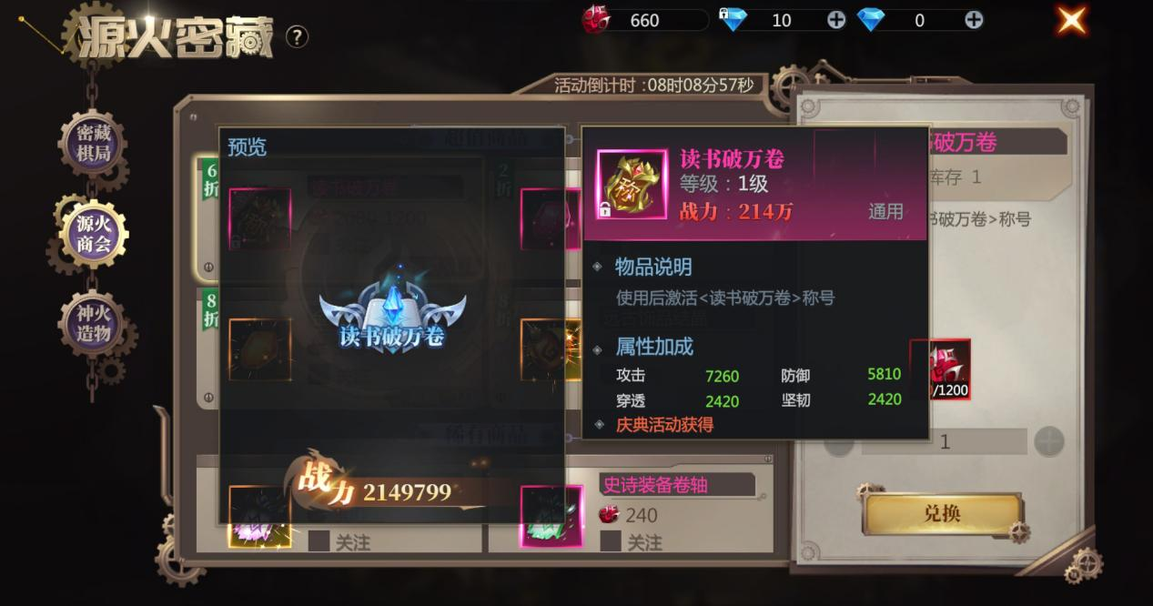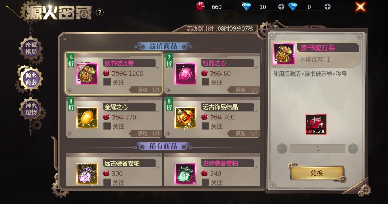 源火密藏限时6月28日开放,参与源火密藏活动获取荣誉水晶,还可以前往源火商会折扣兑换活动称号-【读书破万卷】,各类装备卷轴,碎片材料也同步开放兑换,超值兑换的数量可不多,赶紧来吧!