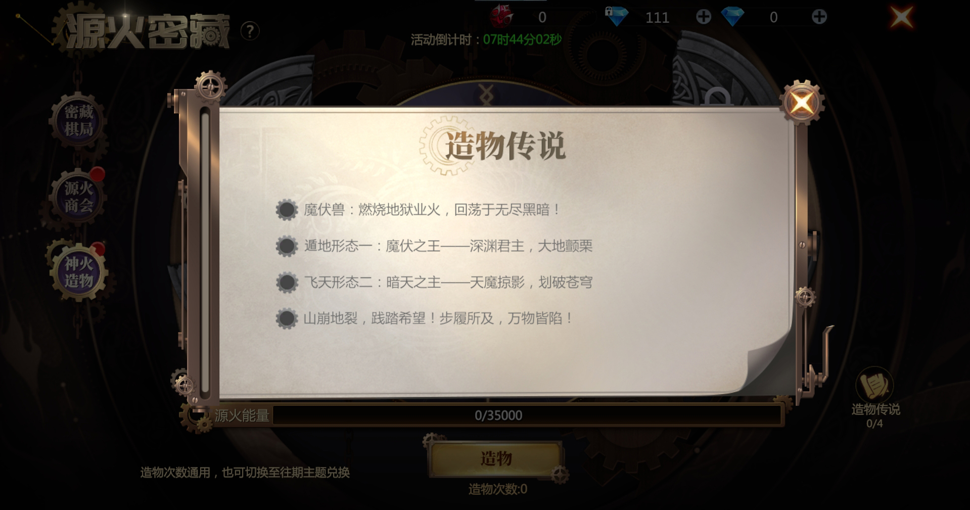 【魔伏兽】线索尚且封印在源火密藏中,小佐拉邀请无眠者们一起执棋破局,消耗源火令牌即可参与破局,破局进程达到一定程度,即可解锁【魔伏兽】线索传说。集齐所有造物传说,天工们即可开始点燃神火开始造物~