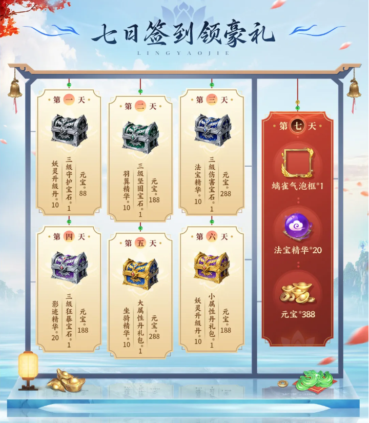 连续登录七天,每日均有资源宝石等好礼相送,助力战力持续飙升。第七天更可领取限定「螭雀」气泡框,伴你闪耀仙途!