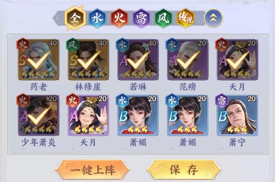 阵容分析:药老开局就能打出群攻,可放在一号位用于压低敌方血线,由二号位的林修崖收割,触发他的击杀再动完成清场。其他的火、风系角色提供羁绊,触发“双源争锋”组队加成(生命+10%、攻击+10%),实战中可不用出手。药老、林修崖练度足够时,本阵容可轻松打到第四章以上。