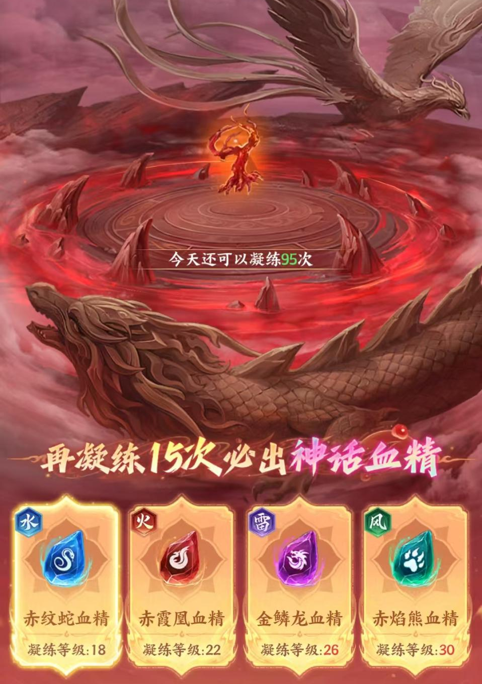 消耗【势力贡献】可以进行血精凝练,优先将水,火,雷,风的血精均凝练一个橙色品质用于增强战力后,再合力凝练次数出神话血精!