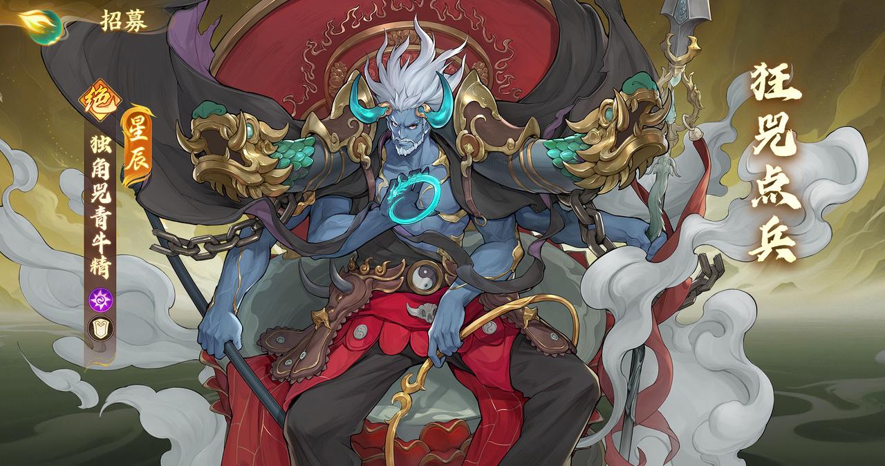 【活动说明】活动期间,可在「星辰」角色招募活动中获取全新绝品品质磐石角色「独角兕青牛精(魔)」。本次招募活动中,将会获得一定数量的兑换代币「辰缘晶·牛角」,此代币可用于在「招募兑换商店」中兑换奖励。