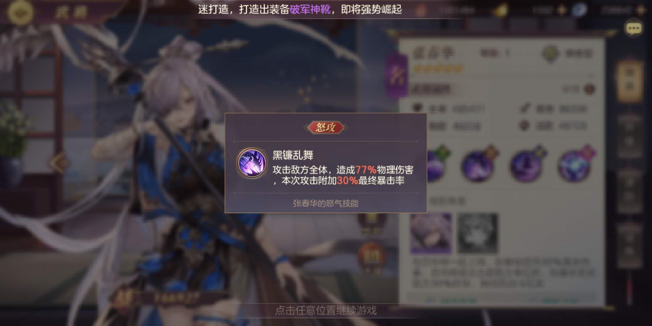 然后就是最后的张春华,其强度很高但是最起码无双才能使用,其机制在于大量的增伤,普攻打击血量最少单位,以及杀人回怒。让我们来一块看一下:
