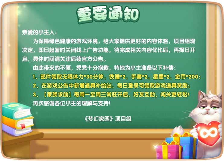 为保障绿色健康的游戏环境,给大家提供更好的内容体验,管家委员会现决定,即日起暂时关闭线上广告功能。待完成相关内容优化后,再择日开启,具体时间请关注后续官方公告。