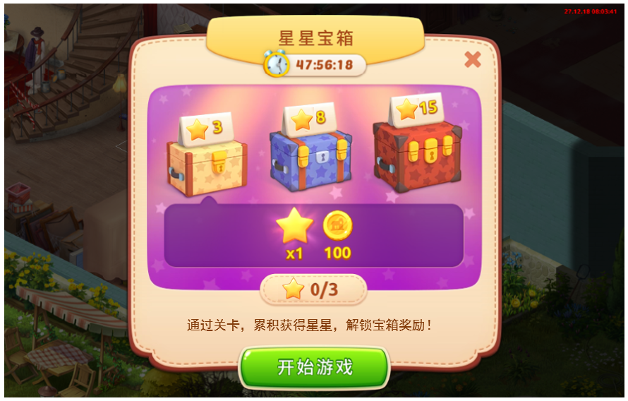 小主人在规定时间内闯关可积累星星⭐,积累到一定星星数量时可解锁宝箱