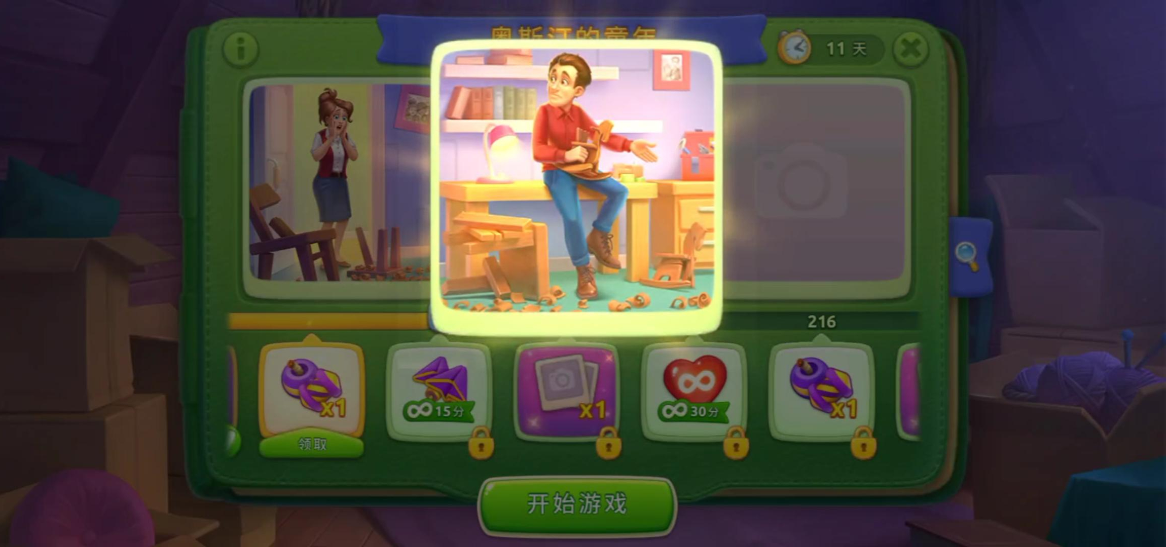 集满三段照片就可解锁一段奥斯汀的童年回忆,点击右侧放大镜→查看相册收集进度