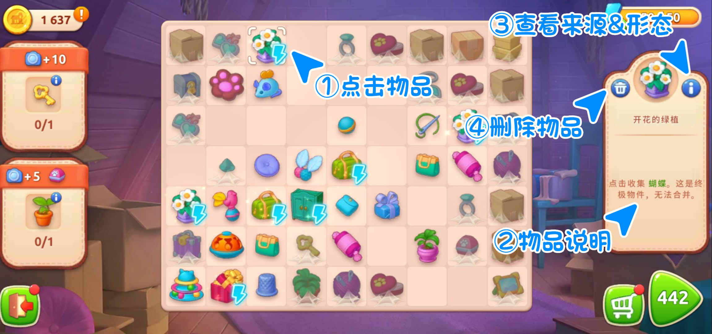 在蜘蛛网中的物品,可以拖动同类物品直接合成解锁。