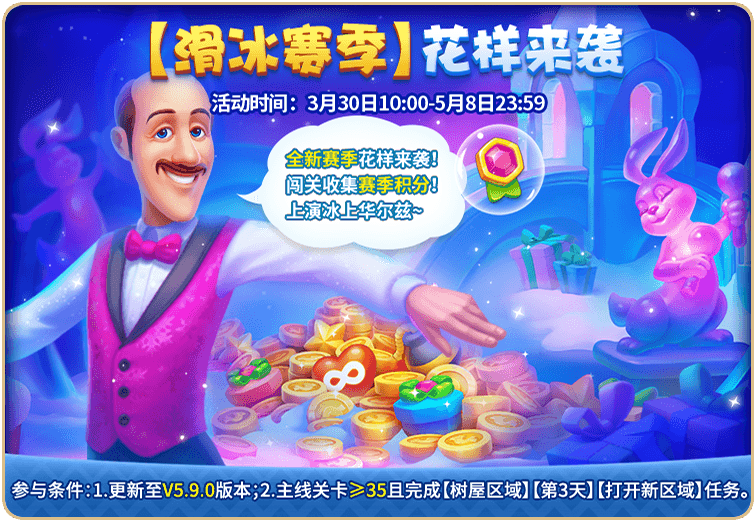 活动玩法:闯主线关卡或黄金杯关卡收集积分提升赛季等级,达到不同等级即可领取对应奖励,再购买黄金券就可解锁炫酷滑冰场,还能让管家解锁新鲜的滑冰技巧。