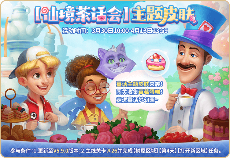 活动玩法:闯关收集草莓蛋糕代币,兑换仙境茶话会系列装饰品,将你的花园改造成仙境般的茶话会,亲手打造童话中梦幻的爱丽丝仙境。