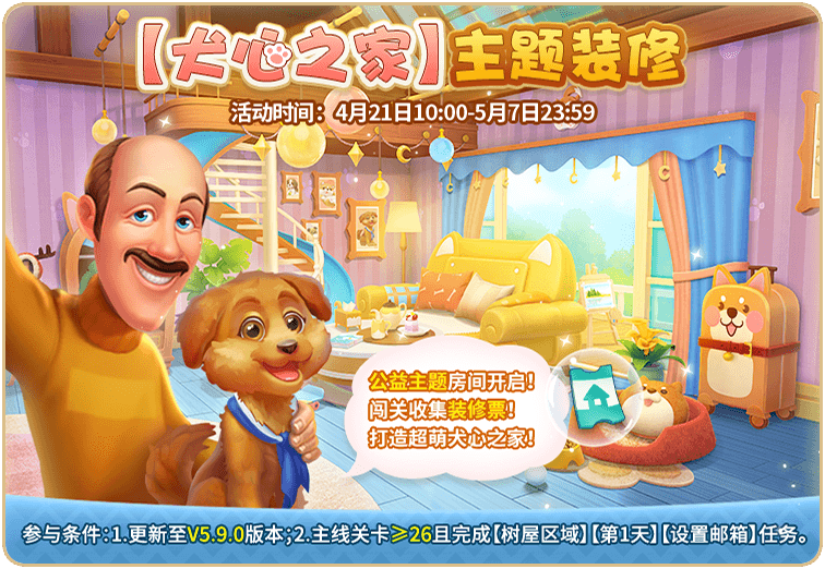 活动玩法:超萌公益主题房间开启,闯关收集装修票,从无到有打造专属于你的犬心之家,装修过程中有大量道具奖励可获得,完成全部装修还有