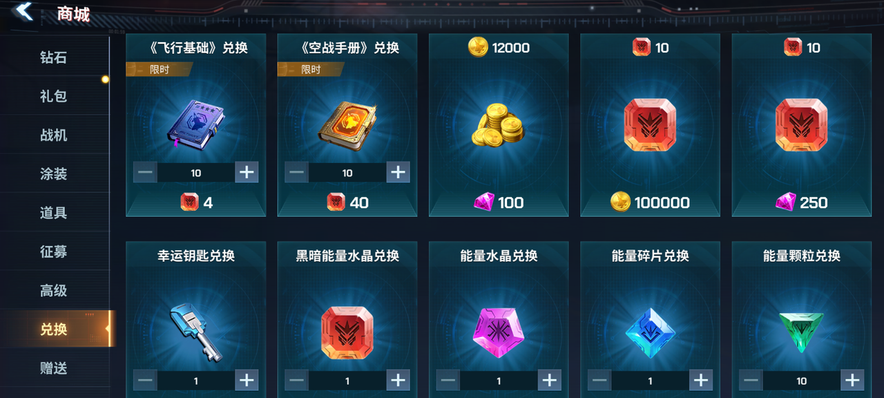 飞行员经验兑换-还在为如何获取飞行员经验升级而发愁吗?本次周年庆限时开启《飞行基础》《空战手册》商城兑换活动!花费4个黑暗能量水晶即可兑换10本《飞行基础》,40个黑暗能量水晶即可兑换10本《空战手册》,兑换数量不限上限,机会难得,千万不要错过哦!