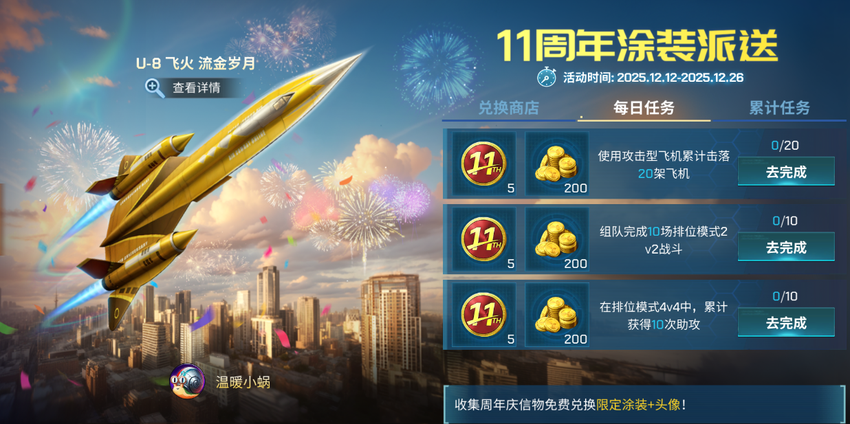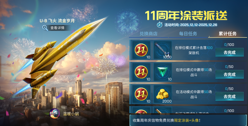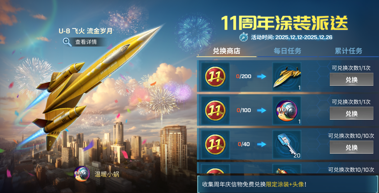 十一年,一段足以铭刻传奇的旅程。感谢每一位始终翱翔在蓝天上的飞行员,是你们的坚持、热爱与支持,让这片天空始终充满激情与活力!活动期间,只需完成指定任务,即可收集【周年庆信物】,用于兑换周年限定涂装、周年庆头像等珍稀奖励