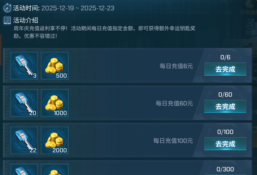 周年庆充值返利享不停!活动期间每日充值指定金额,即可获得额外幸运钥匙奖励,优惠不容错过!