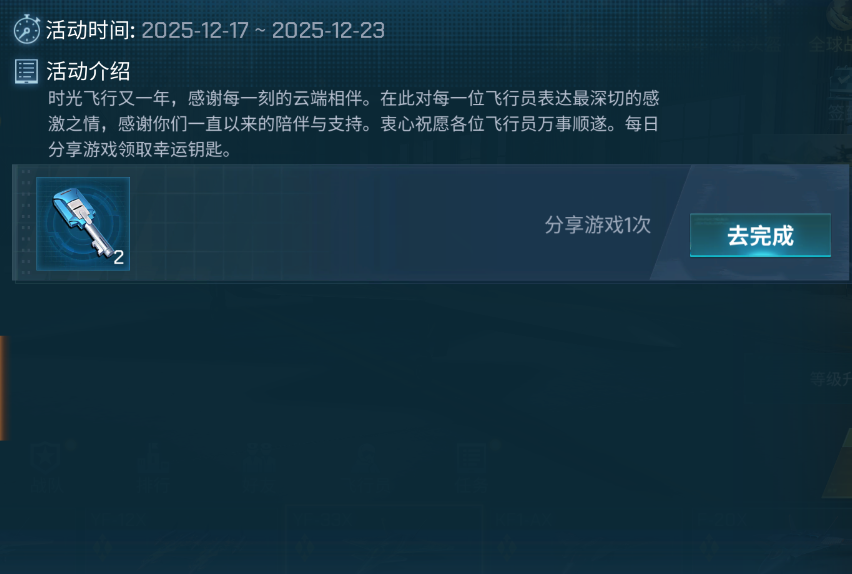 时光飞行又一年,感谢每一刻的云端相伴。在此对每一位飞行员表达最深切的感激之情,感谢你们一直以来的陪伴与支持。衷心祝愿各位飞行员万事顺遂。每日分享游戏领取幸运钥匙。