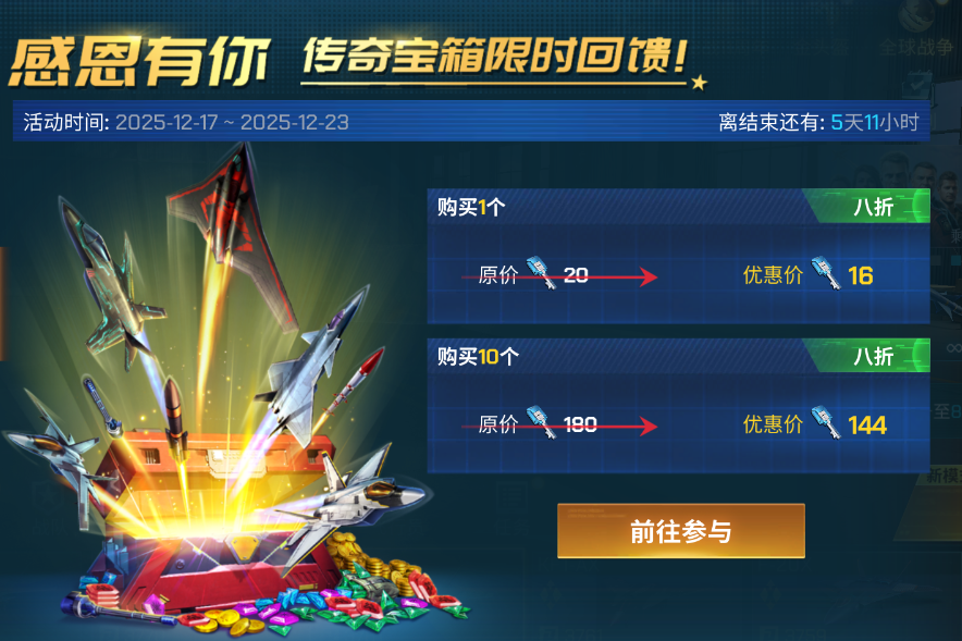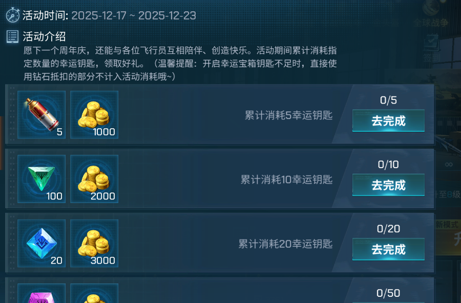 愿下一个周年庆,还能与各位飞行员互相陪伴、创造快乐。活动期间累计消耗指定数量的幸运钥匙,领取幸运钥匙。(温馨提醒:开启幸运宝箱钥匙不足时,直接使用钻石抵扣的部分不计入活动消耗哦~)