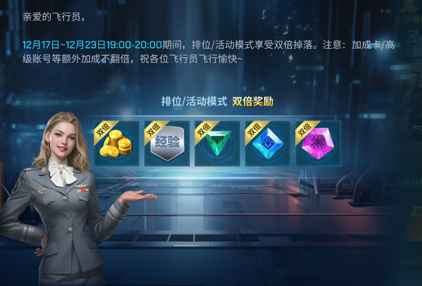 亲爱的飞行员,12月17日12月23日 19:00-20:00期间,排位/活动模式享受双倍金币、经验、能量颗粒、能量碎片、能量水晶掉落。注意:加成卡/高级账号等额外加成不翻倍,祝各位飞行员飞行愉快~