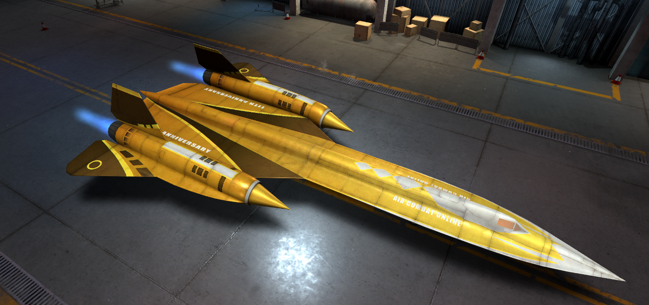 鎏金基底上,几缕银白线条如月光流淌,既中和了金色的厚重,又衬出机身凌厉的流线型轮廓 —— 像把岁月里的高光时刻,都凝在了这抹清透的亮白里。而机身上 “11 ANNIVERSARY” “AIR COMBAT ONLINE”的字样,像是给这段鎏金岁月盖下的纪念戳,藏着《现代空战 3D》十一年里的每一场热血对决。机翼与引擎处点缀的暗纹,像被风揉碎的金箔,既添了细节的精致感,又让整机带着 “历久弥新” 的质感 —— 鎏金裹着锋芒,银白载着回忆,这抹 “流金”,就是十年空战里最耀眼的那道尾迹。