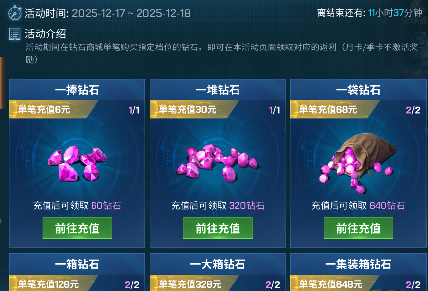 活动期间在钻石商城单笔购买指定档位的钻石,即可在本活动页面领取对应的返利(月卡/季卡不激活奖励)