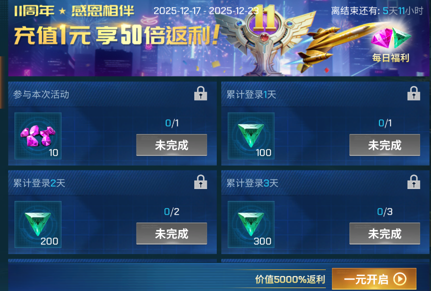 11周年,感恩相伴,活动期间内充值1元即可开启福利任务,完成任务即可享50倍返利,钻石、能量、喷罐、幸运钥匙等海量好礼等你获取。每日还可以在活动页面领取每日福利[钻石*5,能量水晶颗粒*5]