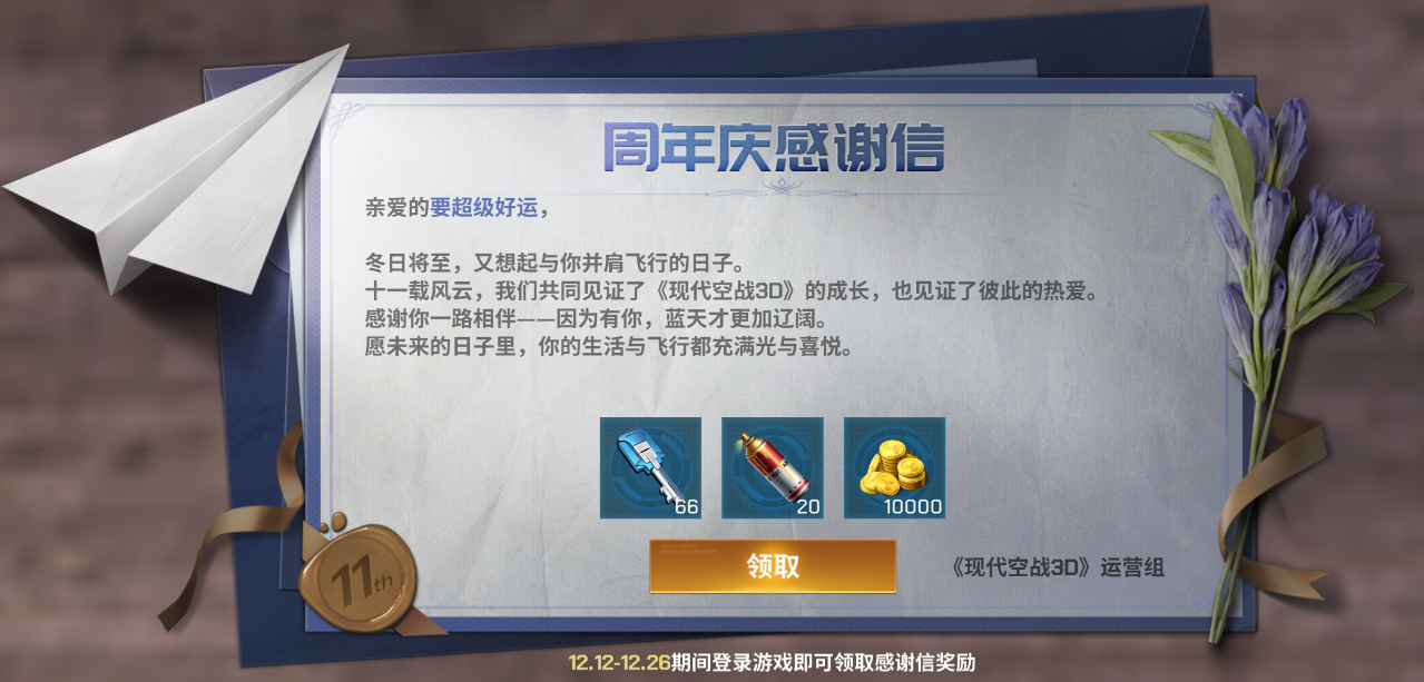 大家好!又是一年相伴,《现代空战3D》迎来了属于我们的 第 11 个周年。十一年,是坚持,更是传奇。过去十年我们一起经历风雨,而从第十年迈向第十一个年头,是全新的航线、全新的篇章。