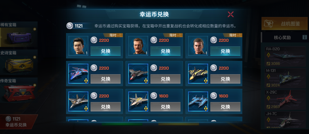 飞行员兑换-活动期间只需花费 2200 幸运币,即可兑换一名五星飞行员,为你的空中旅途保驾护航!本次上架飞行员:江天宇、罗德里格斯、霍纳。你可以根据自己的战术需求,挑选最适合的飞行员加入队伍。如果幸运币充足,也可以全部收入麾下,再也不用担心招募不到顶级飞行员,让强力飞行员助你征战蓝天,赢得每一场胜利吧!