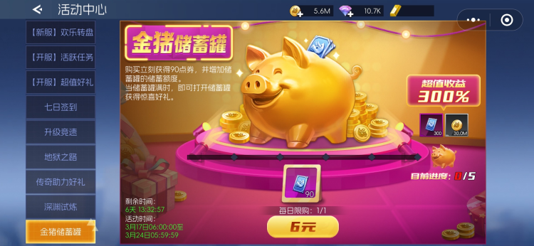 每天购买“金猪储蓄罐”折扣礼,可立刻获得90点券,并增加储蓄罐的储蓄额度。当储蓄罐满时,可打开储蓄罐获得额外奖励。