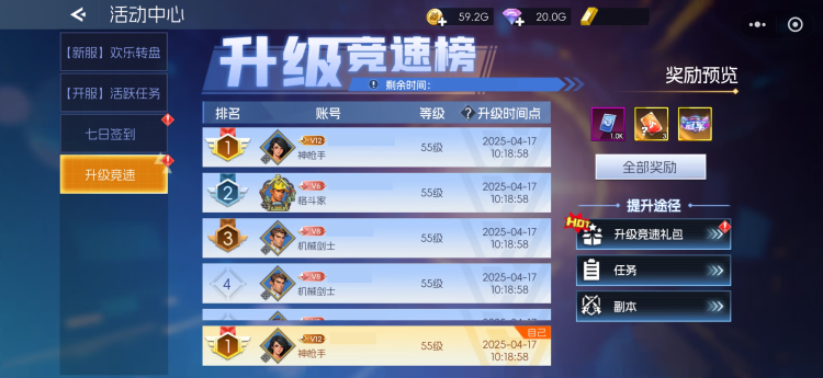 通过通关副本、组队刷本、双倍挑战券等方式快速提升等级,达到满级会立刻定榜,拼的就是速度!有机会获得稀有的专属称号、史诗卡片、点券等丰厚奖励哦!想要知道如何快速提升等级,也可以关注我们之前出的攻略“高效刷图指南”,学习快速升级的技巧哦!