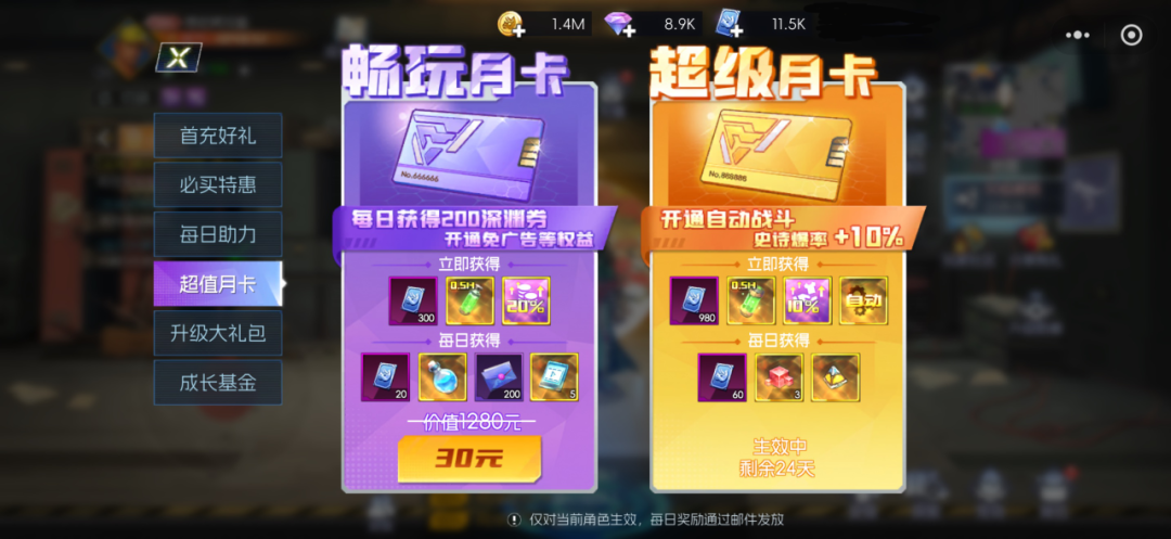1.购买“超级月卡”,可以获得30天自动战斗权益。