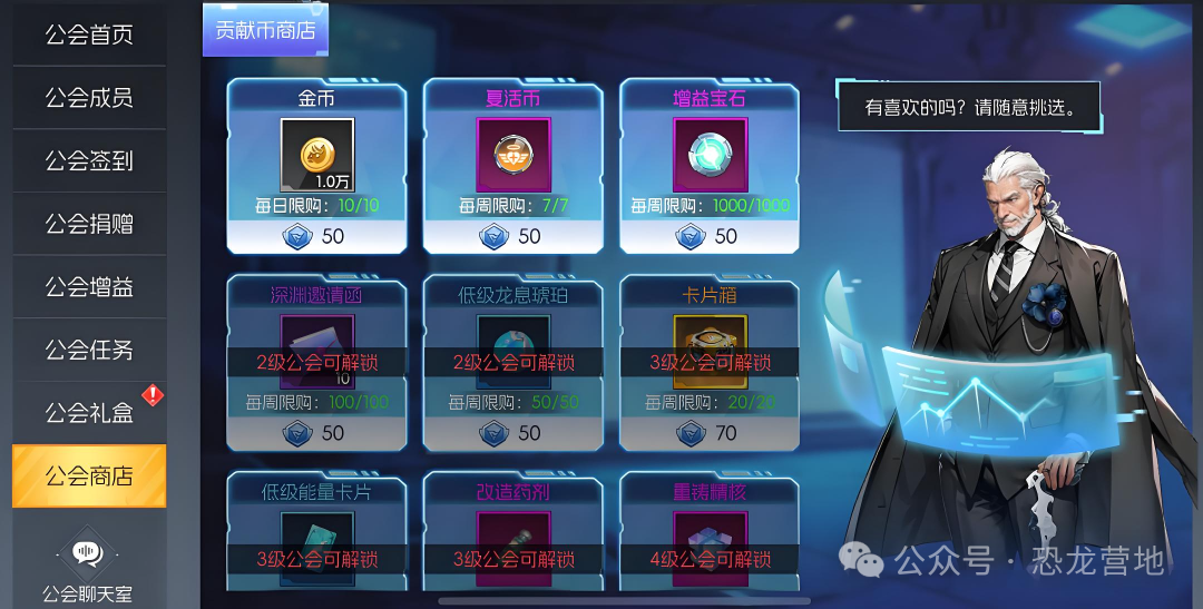 你的私房钱(贡献币)主要消费场所!好东西不少,但很多高级货需要公会等级解锁,所以……你懂的,继续催会长升级!
