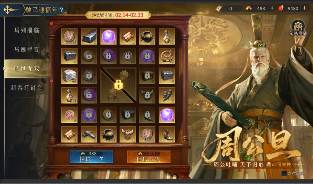 活动内容:本次“昭世无双”将迎来全新英雄——周公旦。 参与活动可获得专属抽奖券,抽取昭世无双大奖。(半周年与本次活动获得的无双契印都可兑换商城中的物品)