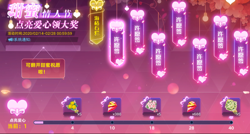 活动内容:浪漫情人节,许下最甜蜜的愿望!活动期间翻开祈愿签即可获得流星碎片,金币和经验果等奖励;累积祈愿更有大量好礼相送!