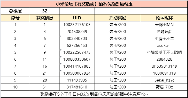 2.各位忍忍请按照示例的格式回复,楼主将根据回复内容抽取十位忍忍获得“200勾玉”一份。