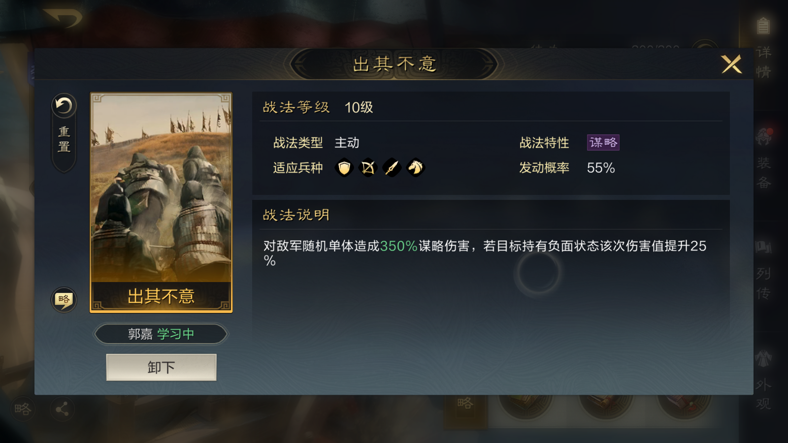 郭嘉最优携带【出其不意】和【奇门遁甲】!!郭嘉使用【出其不意】战法优势最大,因为有概率释放两次,而【奇门遁甲】造成的控制效果和伤害也只有郭嘉能打出最大效果。