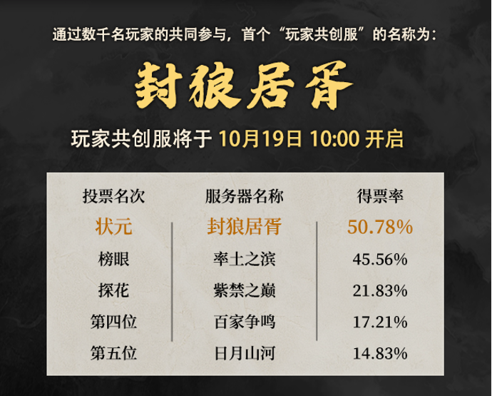 首个”玩家共创服“的名称已确定,有50.78%的玩家给”封狼居胥“进行投票,得到了诸位主公的青睐,拔得头筹!最终投票的前五名为: