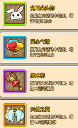 使用兔耳朵头饰、爱心气球、魔术棒、天使之翼,就可以获得活动积分和活动经验,活动积分可以在商店里兑换奖励!