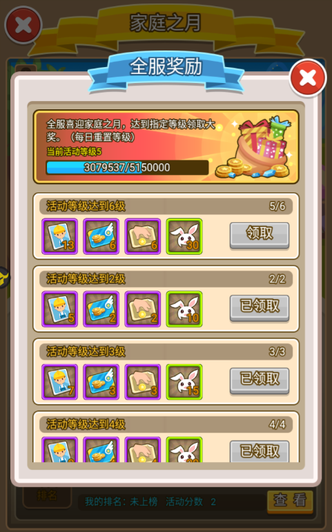 家庭之月积分达到指定等级还可以解锁全服奖励,并且每日重置全服奖励,老板们冲鸭!