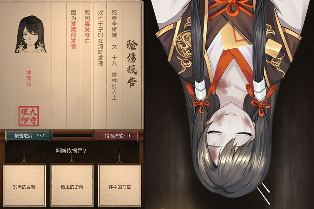 在仵作房摇曳的灯火下,新手捕快明显瑟瑟发抖不敢向前,我则冷静地观察受害者身上的证据,试图还原出遇害原因和其真正的致命伤。