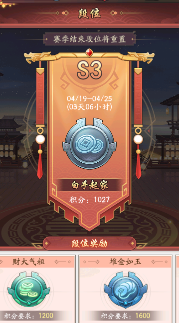 在积分达到段位要求时,将会得到晋升,而如果切磋失败,分数下降时,也会根据积分进行段位的下降。每次赛季首次晋升到新的段位时,可以领取到一份段位奖励。赛季结束时,段位也会随之重置。