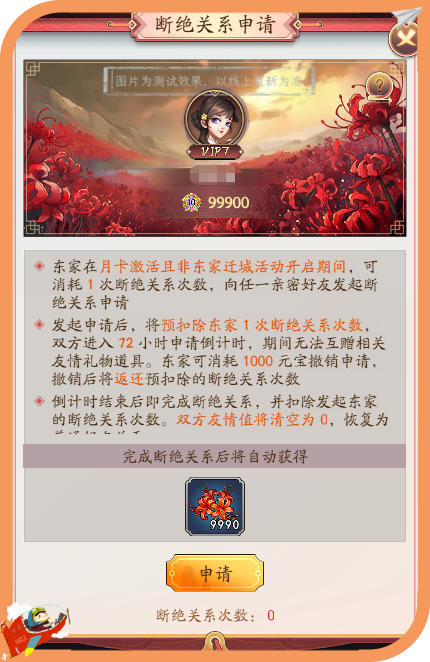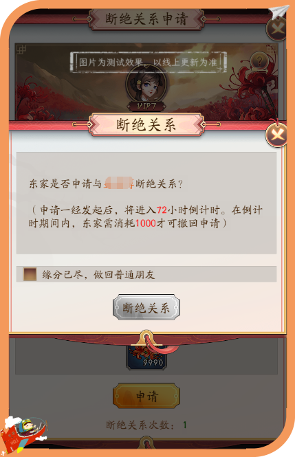 ⑦断绝关系申请发起期间,双方无法向对方赠送友情点相关道具。