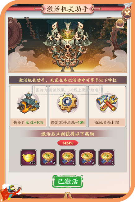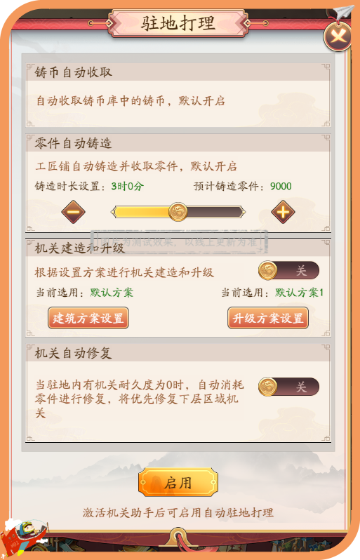 ③助手功能:助手将根据设置的目标等级自动进行铸币收集、零件铸造、机关修建、机关升级、机关修复。