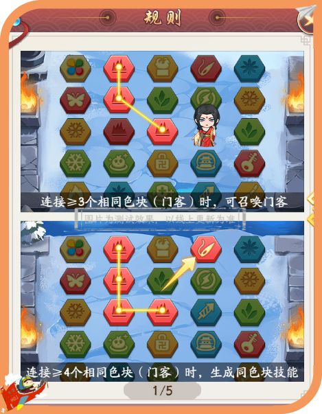 1、进入游戏后,东家连接≥3个相同色块(门客)时,可召唤门客;连接≥4个相同色块(门客)时,可生成同色块技能。