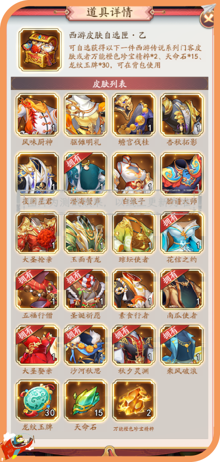 「西游皮肤自选匣·乙」【4套皮肤中选1、龙纹玉牌*30、天命石*15、万能橙色珍宝精粹*2】自选其一