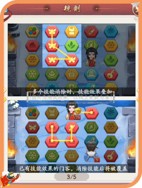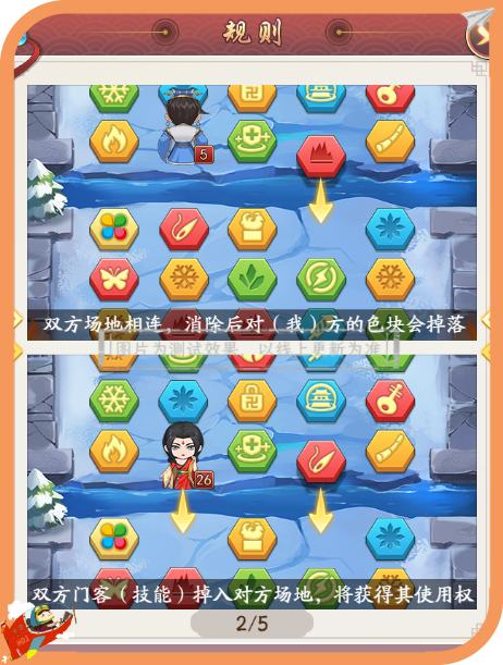 2、双方的场地相连,消除后相应色块会掉落,当双方门客(技能)调入对方场地时,将获得其使用权。