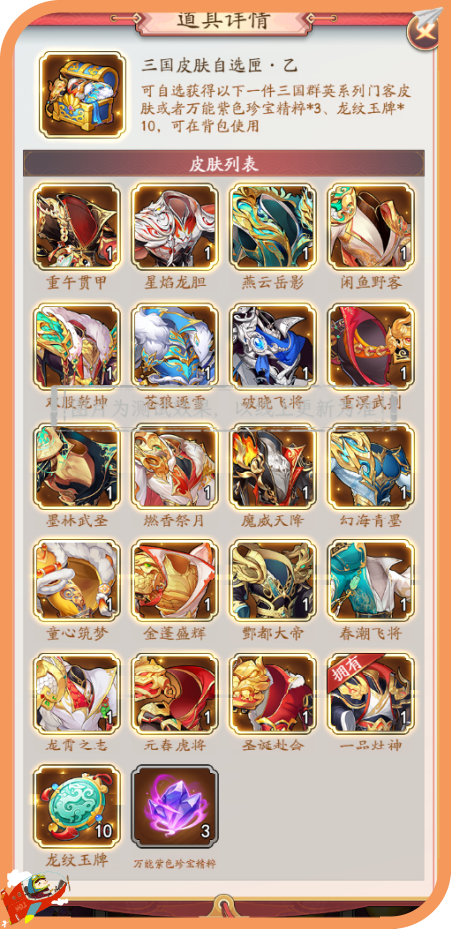 「三国皮肤自选匣·乙」【4套皮肤中选1、龙纹玉牌*10、万能紫色珍宝精粹*3】自选其一
