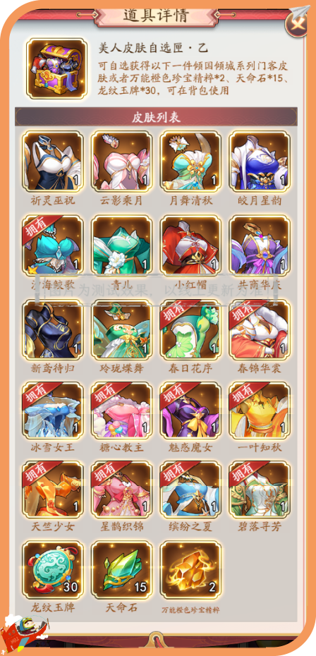 「美人皮肤自选匣·乙」【4套皮肤中选1、龙纹玉牌*30、天命石*15、万能橙色珍宝精粹*2】自选其一