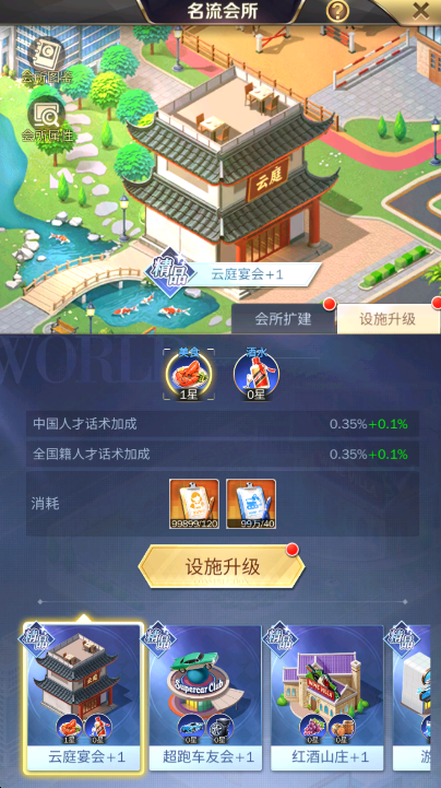 - 无变化。每个会所的扩建、设施升级均为独立玩法,需分别消耗道具完成养成,对应的属性加成也仅针对该会所关联的国籍人才生效。