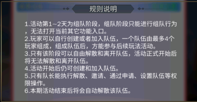 -活动正式开始后(第 3 天 0 点起)仍能创建 / 加入队伍,但不可解散或离开;